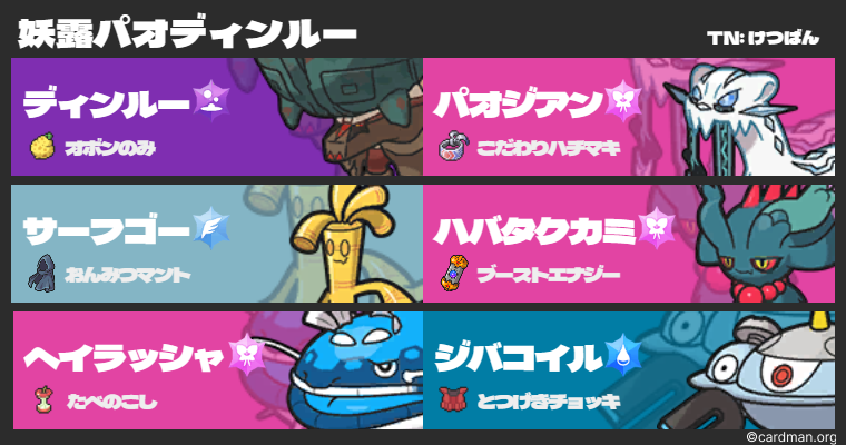 4,5枠目にはここまでで重い特殊炎をはじめ幅広い範囲に投げて仕事ができるディンルーと構築で足りない素早さを補うことができパオディンルーとセットで強く選出できそうなエナジーハバタクカミを組み込んだ。