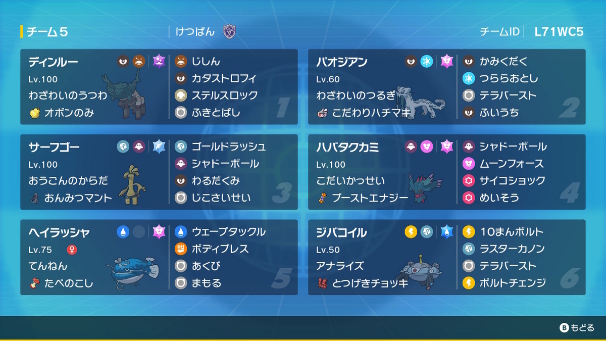テラスタイプは鉢巻逆鱗や悪技意識でフェアリーにしたがあまり切らなかった。ハバタクカミのムーンフォースに耐性が欲しい場面もあったので、鋼や毒も一考か。